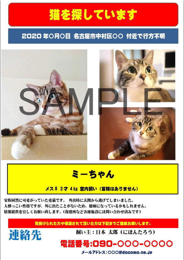 「発見・保護していただいた方には薄謝ながらお礼を致します。」などと記載しておくと真剣さが伝わり、良いでしょう。